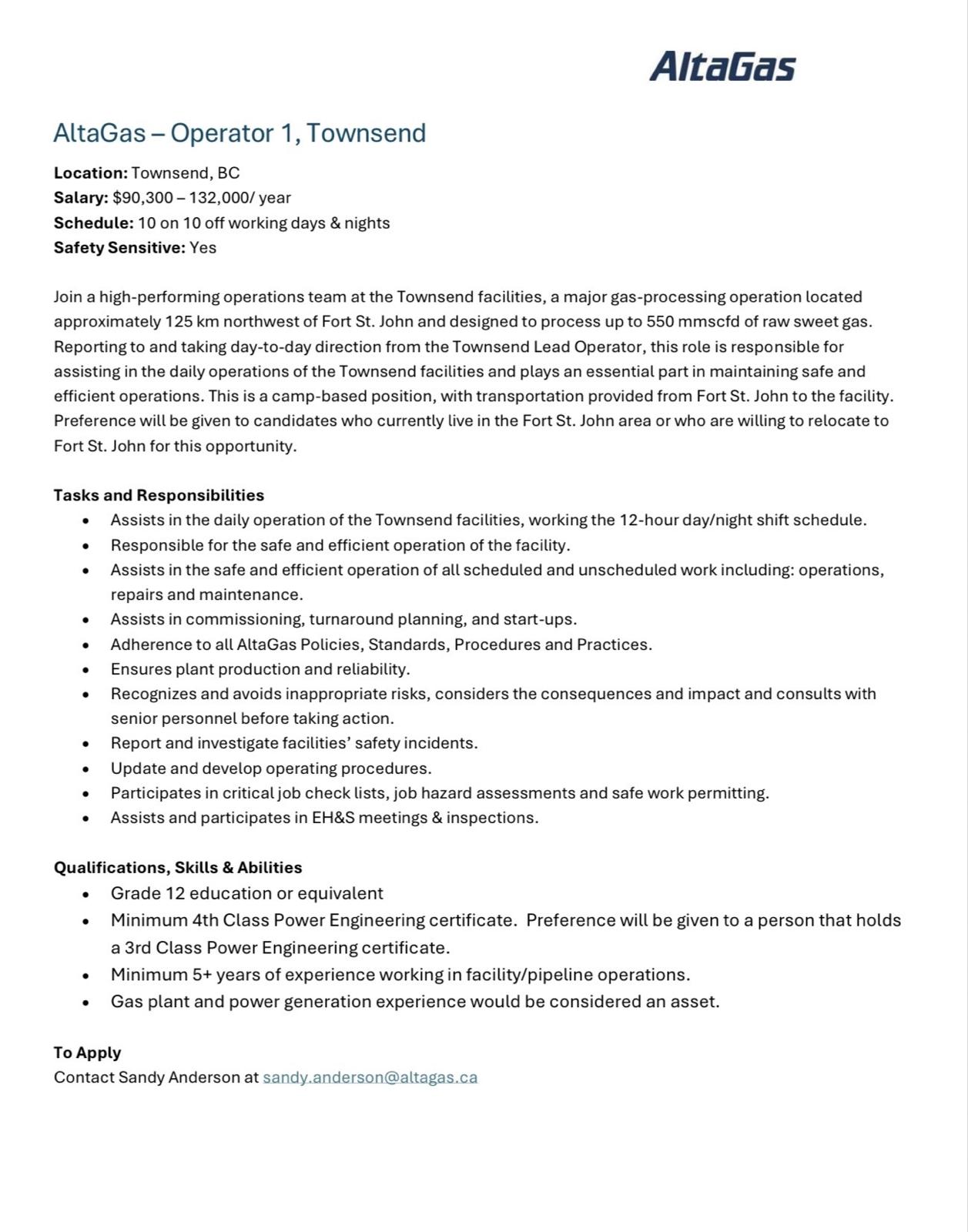 AltaGas is hiring an Operator 1 for its Townsend facilities in BC. This camp-based position offers a 10 on / 10 off schedule and is suited for someone with facility or pipeline operations experience, strong safety awareness, and the ability to support daily plant operations. The Townsend facilities are located northwest of Fort St. John, and transportation is provided from Fort St. John to the facility. More